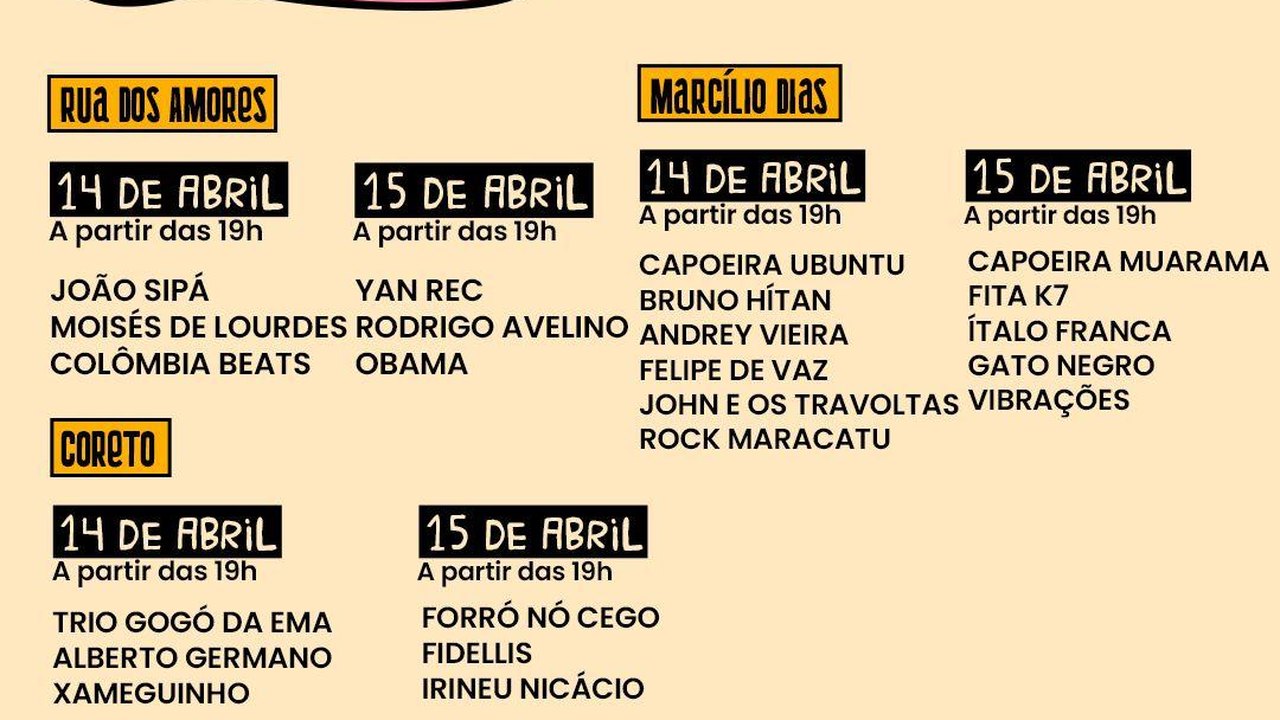 Além dos shows musicais, o evento também contará com feiras livres de arte, apresentações de grupos culturais, artistas circenses, djs, programação infantil e muito mais.