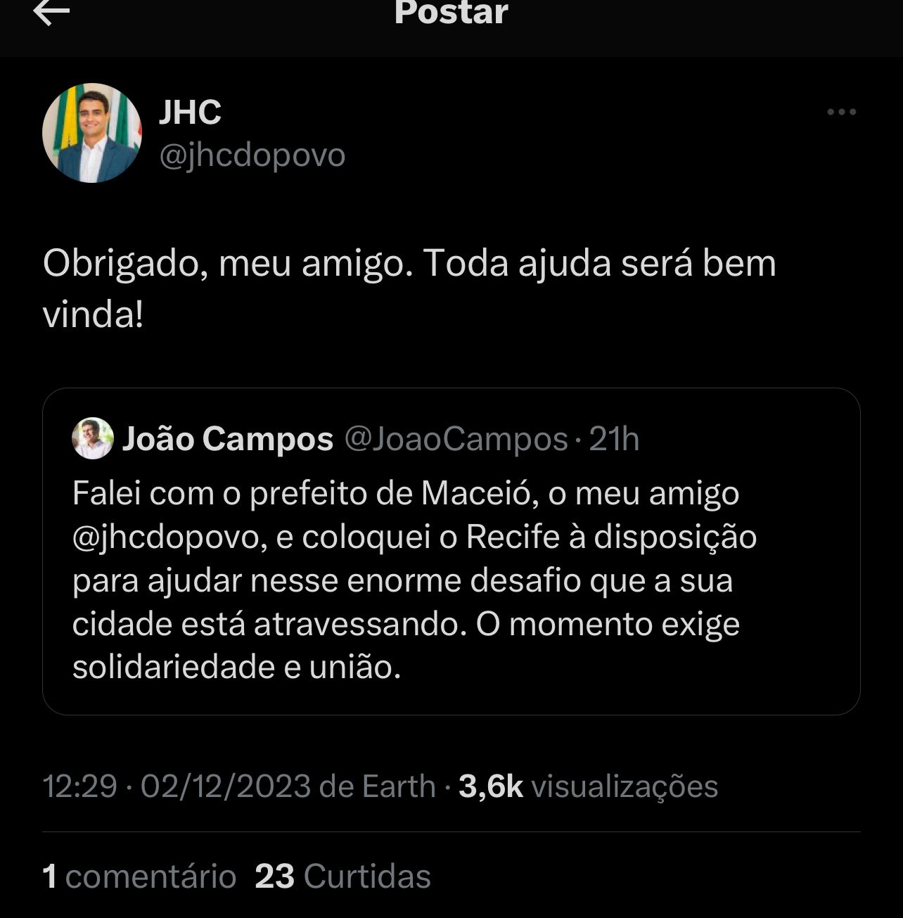 Em seu perfil, João Campos publicou que conversou com o prefeito de Maceió, JHC e que Recife se coloca à disposição nesse desafio: "Coloquei o Recife à disposição para ajudar nesse enorme desafio que a sua cidade está atravessando".