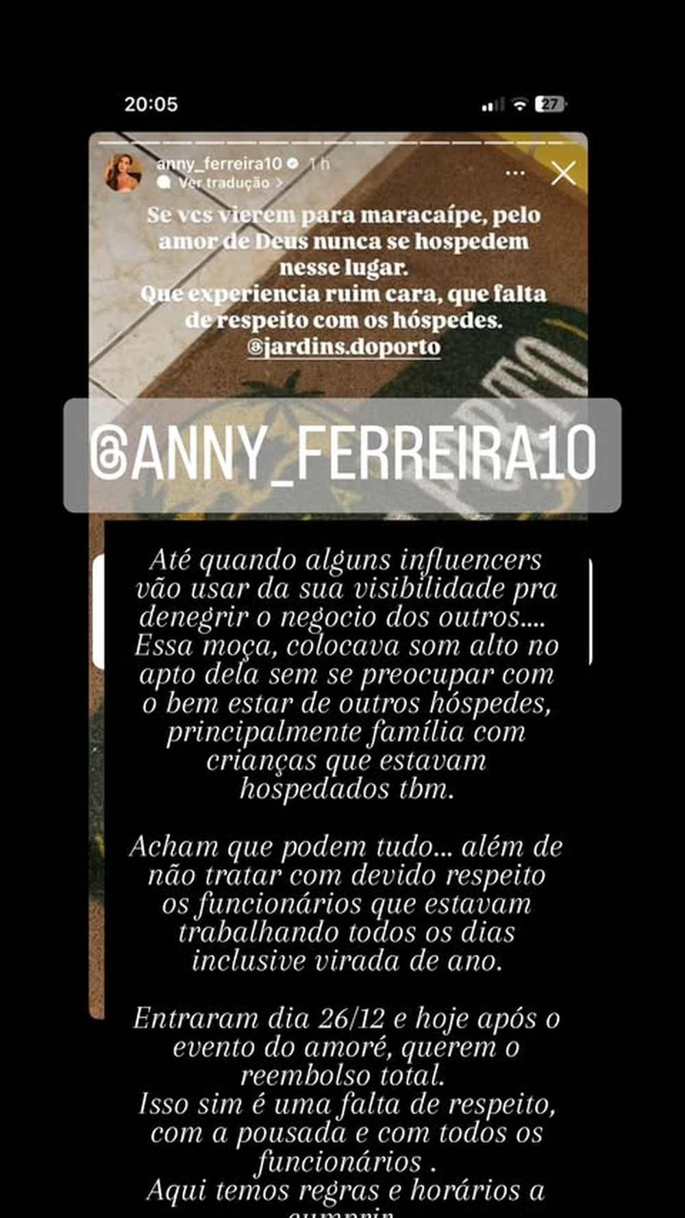 “A moça colocava som alto no quarto dela sem se preocupar com o bem-estar de outros hóspedes. Ela e seus amigos não respeitaram as normas de convivência da pousada e, ao final da estadia, exigiram reembolso, o que consideramos uma falta de respeito com a equipe e com as regras da casa”, afirmou a pousada.