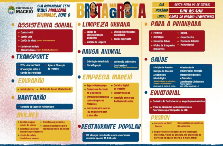 Nesta sexta-feira (3), a Prefeitura de Maceió promove mais uma edição do programa Brota na Grota, desta vez na Grota do Cigano, localizada no bairro do Jacintinho das 9h às 15h. O evento acontece atrás da Creche Cria, reunindo serviços gratuitos que levam cidadania, inclusão social e inovação diretamente para os moradores.