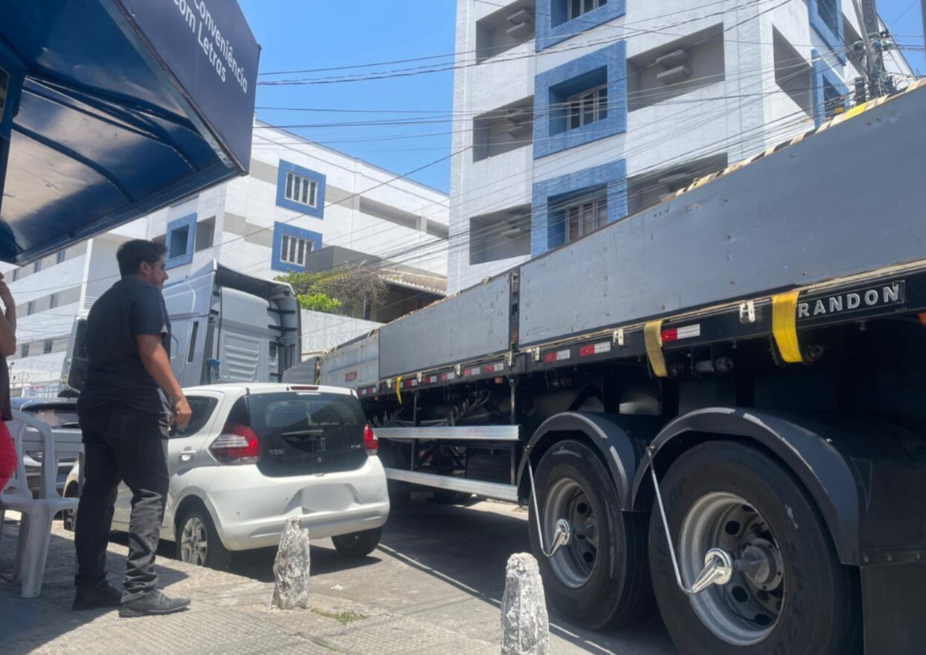 O motorista relatou que não consegue seguir nem retornar, já que veículos menores estão estacionados nos dois lados da rua, impedindo qualquer manobra. Segundo moradores do local, a situação se arrasta há mais de uma hora. O condutor afirmou ainda que tentou localizar os proprietários dos carros, mas não conseguiu.