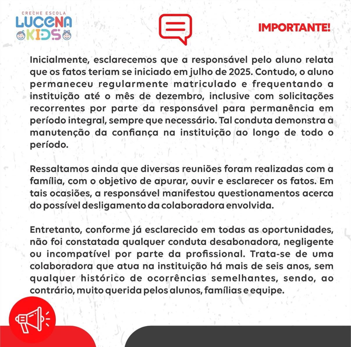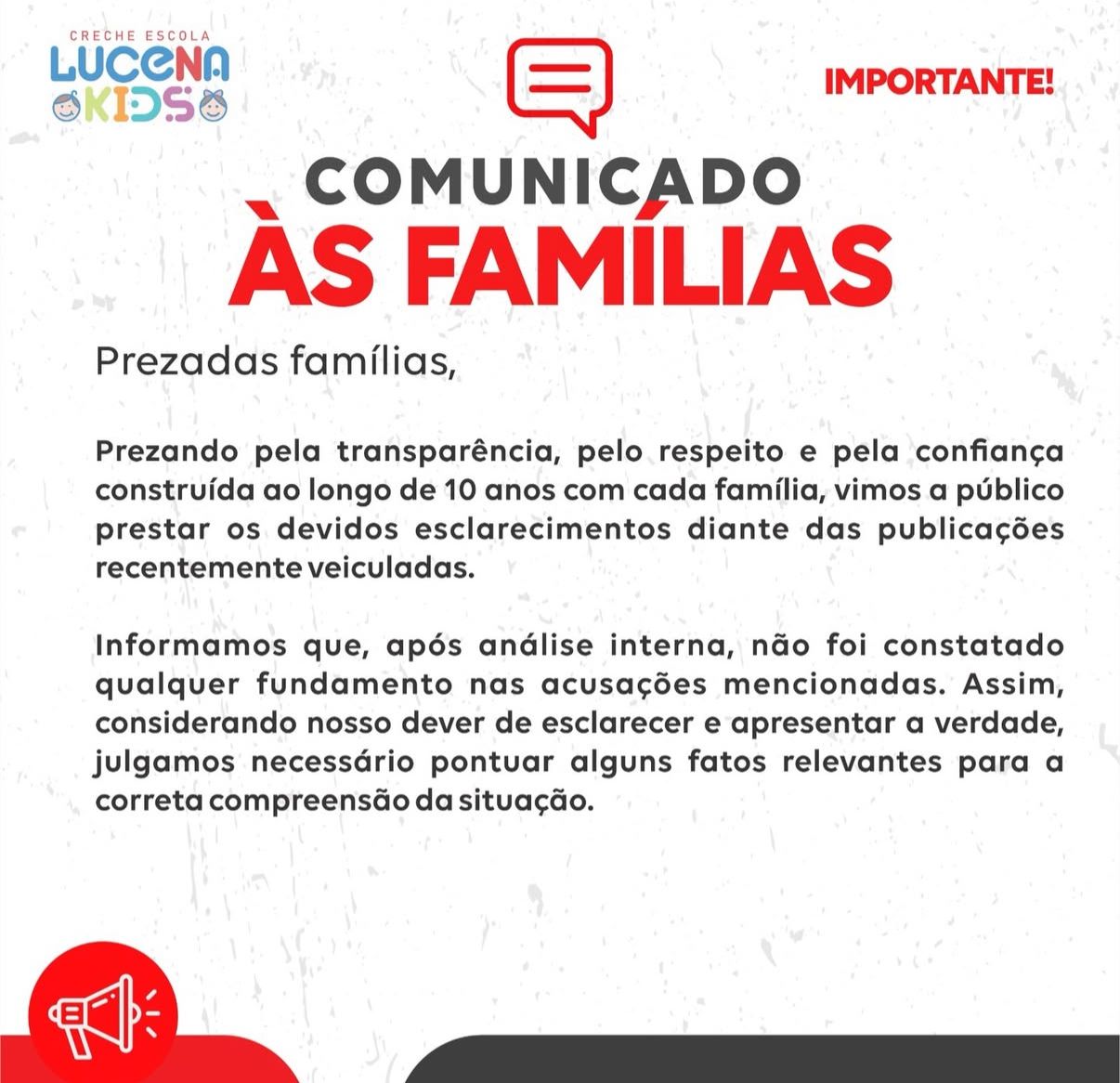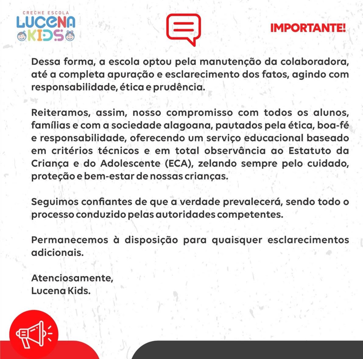 Em nota publicada nas redes sociais, a creche Lucena Kids informou que, após análise interna, não foi constatado qualquer fundamento das acusações e disse que a profissional envolvida não foi afastada. Confira na íntegra: