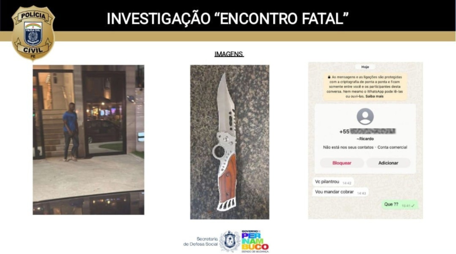 Outro material que chama atenção é o print de mensagens no WhatsApp em que um contato identificado como “Ricardo” envia ameaças a uma das vítimas. Na conversa, o suspeito escreve: “Vc pilantrou” e, em seguida, “Vou mandar cobrar”. A vítima responde: “Que??”. Para os investigadores, o conteúdo reforça o padrão de intimidação e pressão psicológica aplicado durante e após os crimes.