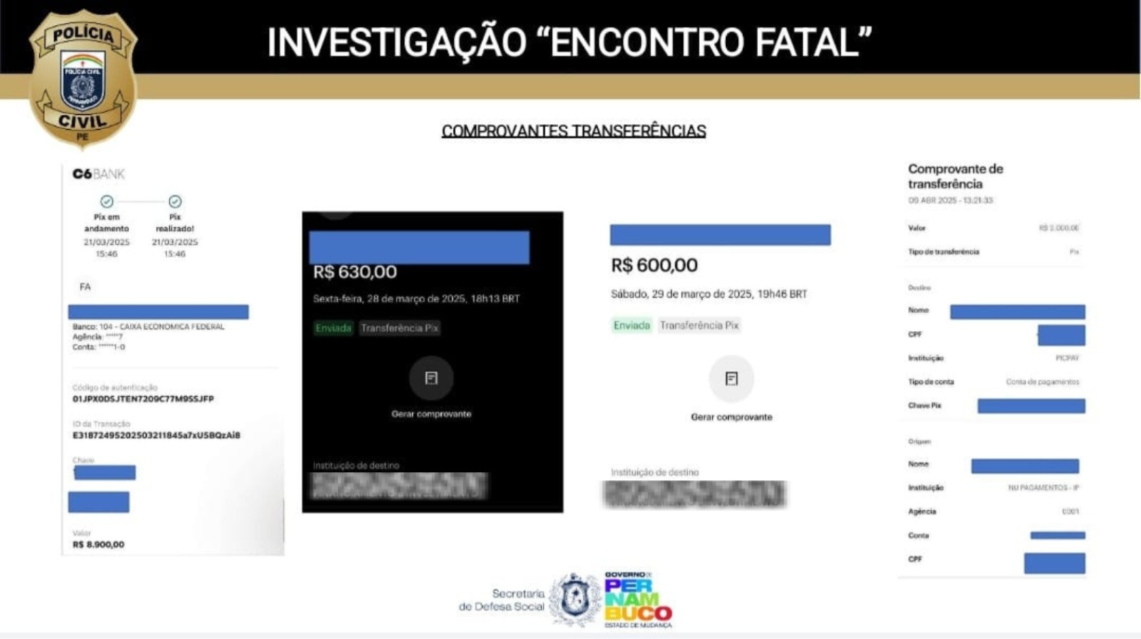 De acordo com as informações repassadas pela Polícia Civil, um dos principais pontos da investigação é o caminho percorrido pelo dinheiro obtido nas extorsões. A apuração identificou transferências realizadas sob coerção, como um comprovante no valor de R$ 630, registrado em 28 de março, que integra o conjunto de evidências reunidas.