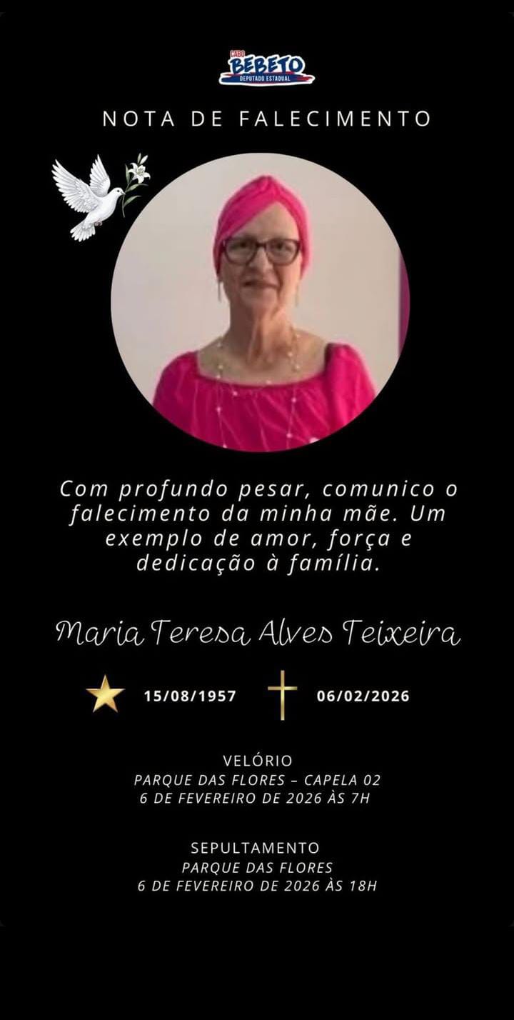 Faleceu, na manhã desta sexta-feira (6), aos 68 anos, Maria Teresa Alves Teixeira, mãe do deputado estadual Cabo Bebeto (PL). Por meio de suas redes sociais, o parlamentar divulgou a triste notícia, informando também horário e local do velório e sepultamento.