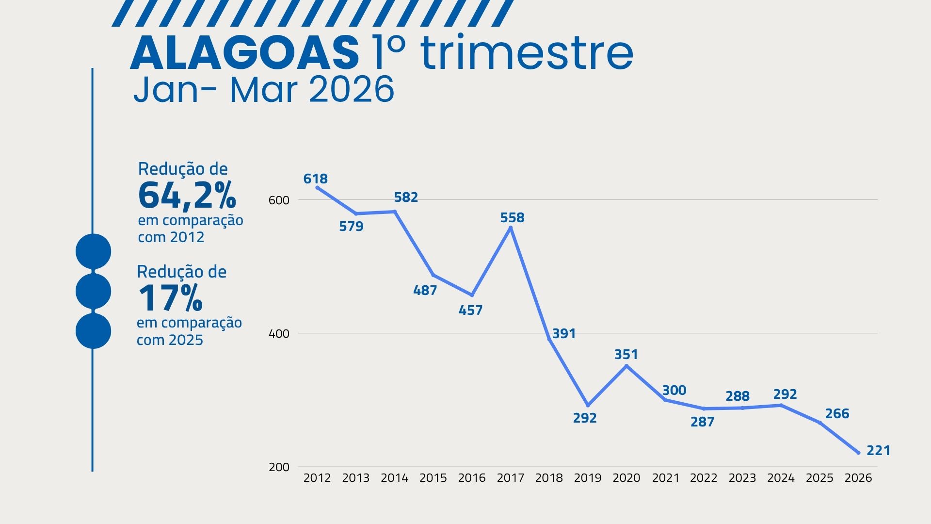 Alagoas registrou, no primeiro trimestre de 2026, o menor número de Crimes Violentos Letais Intencionais (CVLI) de toda a série histórica. De acordo com dados do Núcleo de Estatística e Análise Criminal (Neac) da Secretaria de Estado da Segurança Pública (SSP), divulgados neste sábado (4), de janeiro a março deste ano foram notificados 221 casos, ante 618 apresentados em 2012, quando teve início a série. O resultado representa uma queda de 64,23% no período.