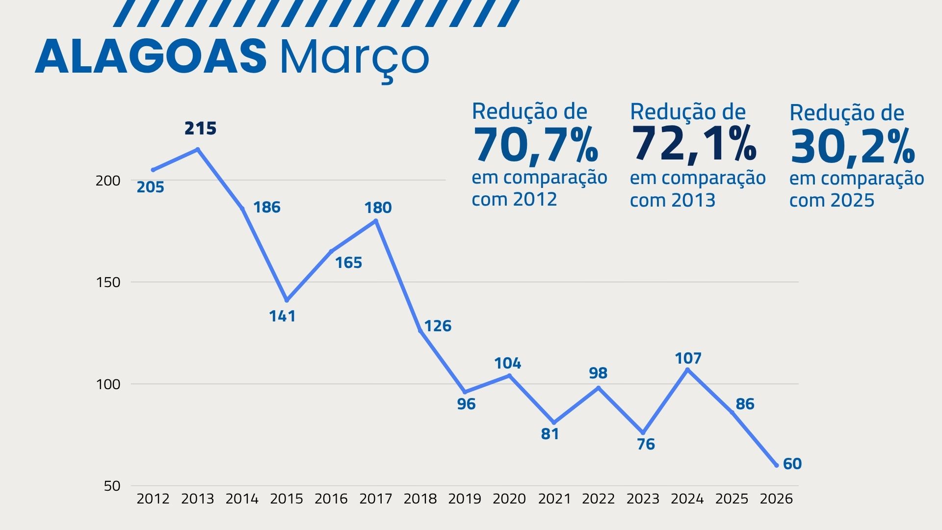 O mês de março de 2026 também registrou em Alagoas o menor número de CVLIs da série histórica. Foram 60 casos, contra 205 do início da série – uma retração de 70,7%. Na comparação com março de 2025, que teve 86 registros, a redução atingiu 30,2%.
