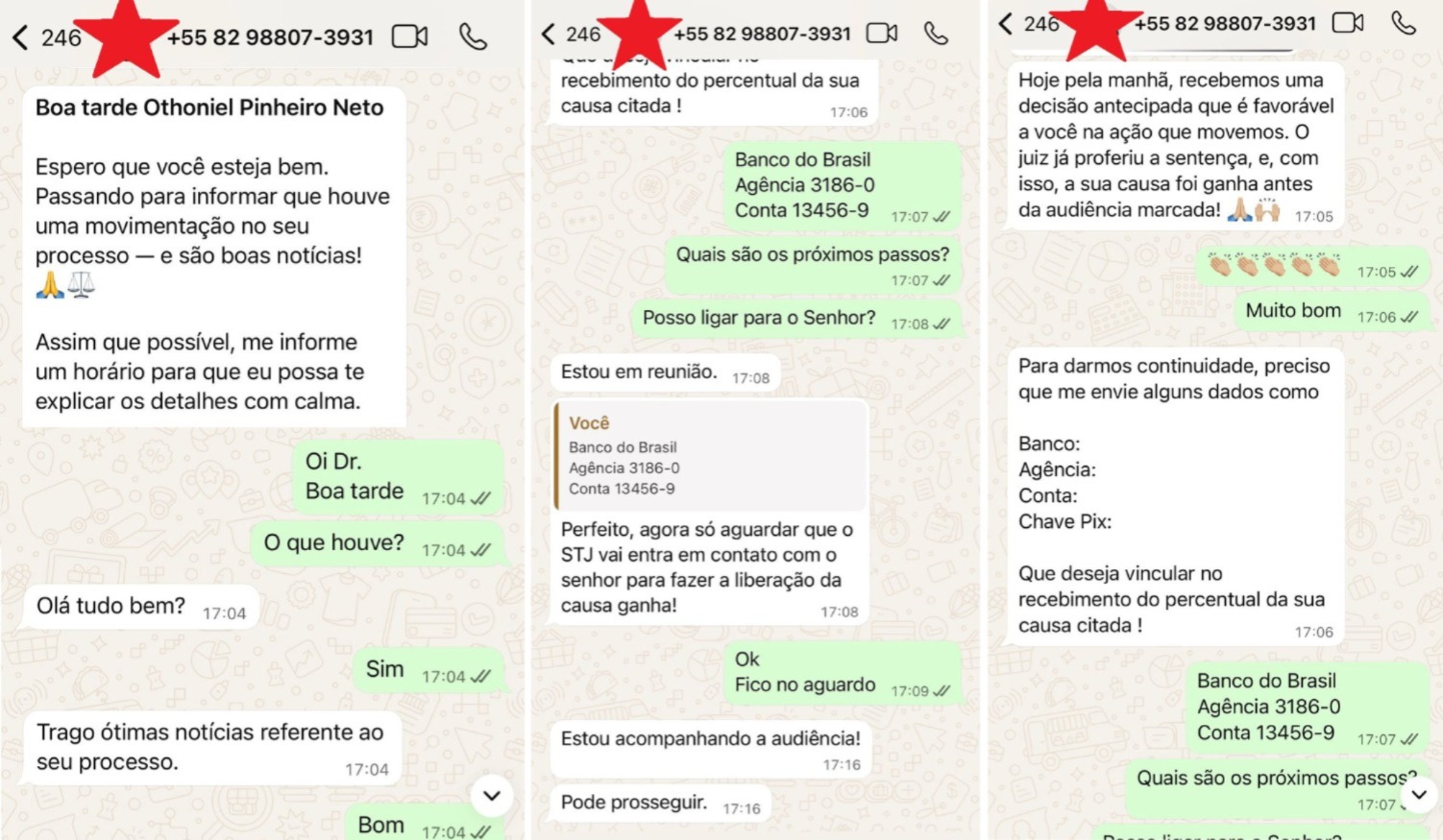 Sabendo desde o início que se tratava do golpe do falso advogado com o perigoso espelhamento de tela, o Defensor Público Othoniel Pinheiro preparou a gravação do procedimento criminoso feito por ligação onde dois golpistas tentaram aplicar o golpe com a técnica de espelhar o celular via Whatsapp. Na fraude, os dois criminosos utilizam informações verdadeiras colhidas em seu processo pessoal em trâmite na justiça, agindo de maneira rápida e tentando convencer a vítima a clicar num ícone na tela do celular (espelhamento de tela geralmente via WhatsApp) sob falsos pretextos técnicos ou bancários.