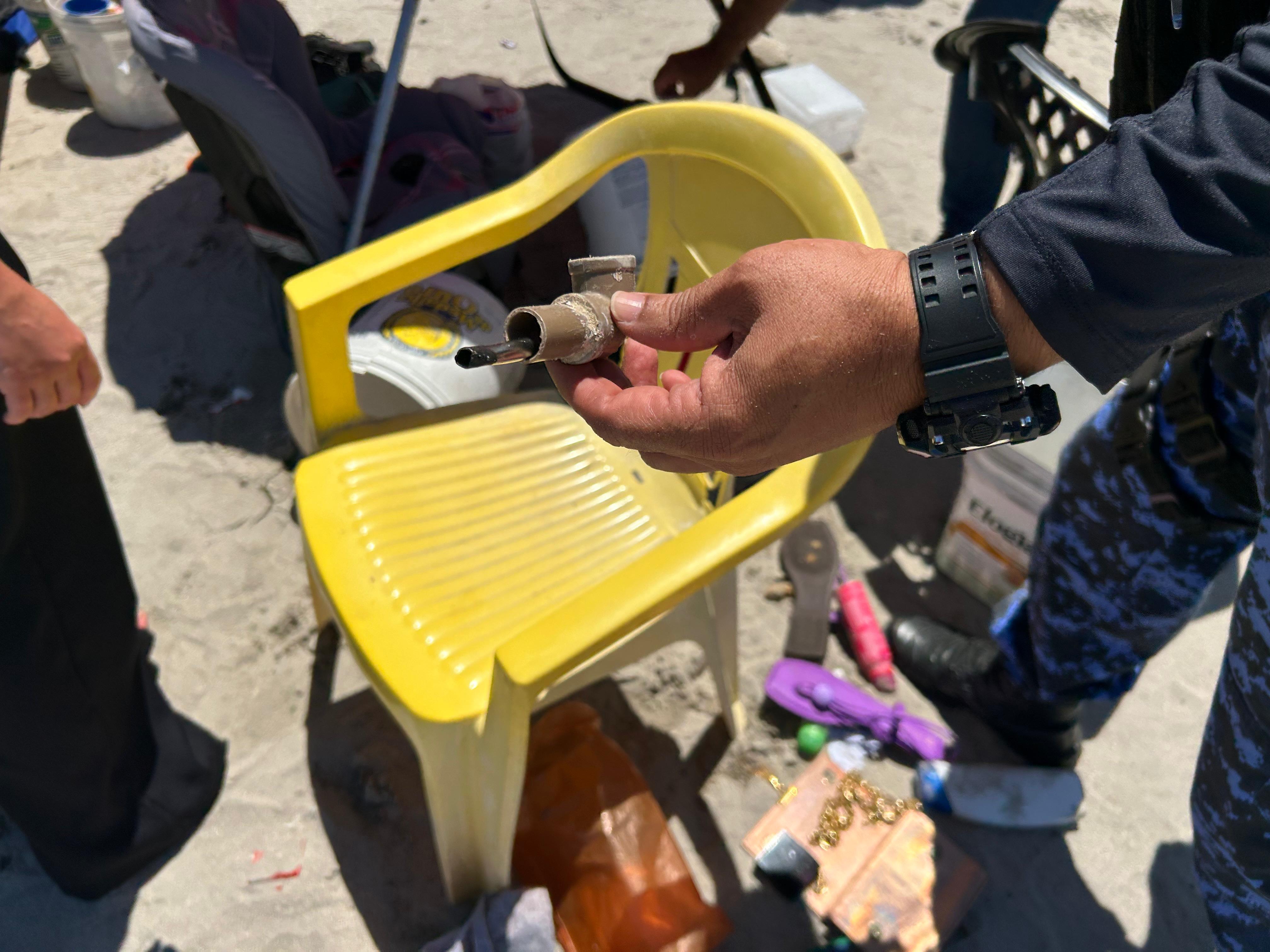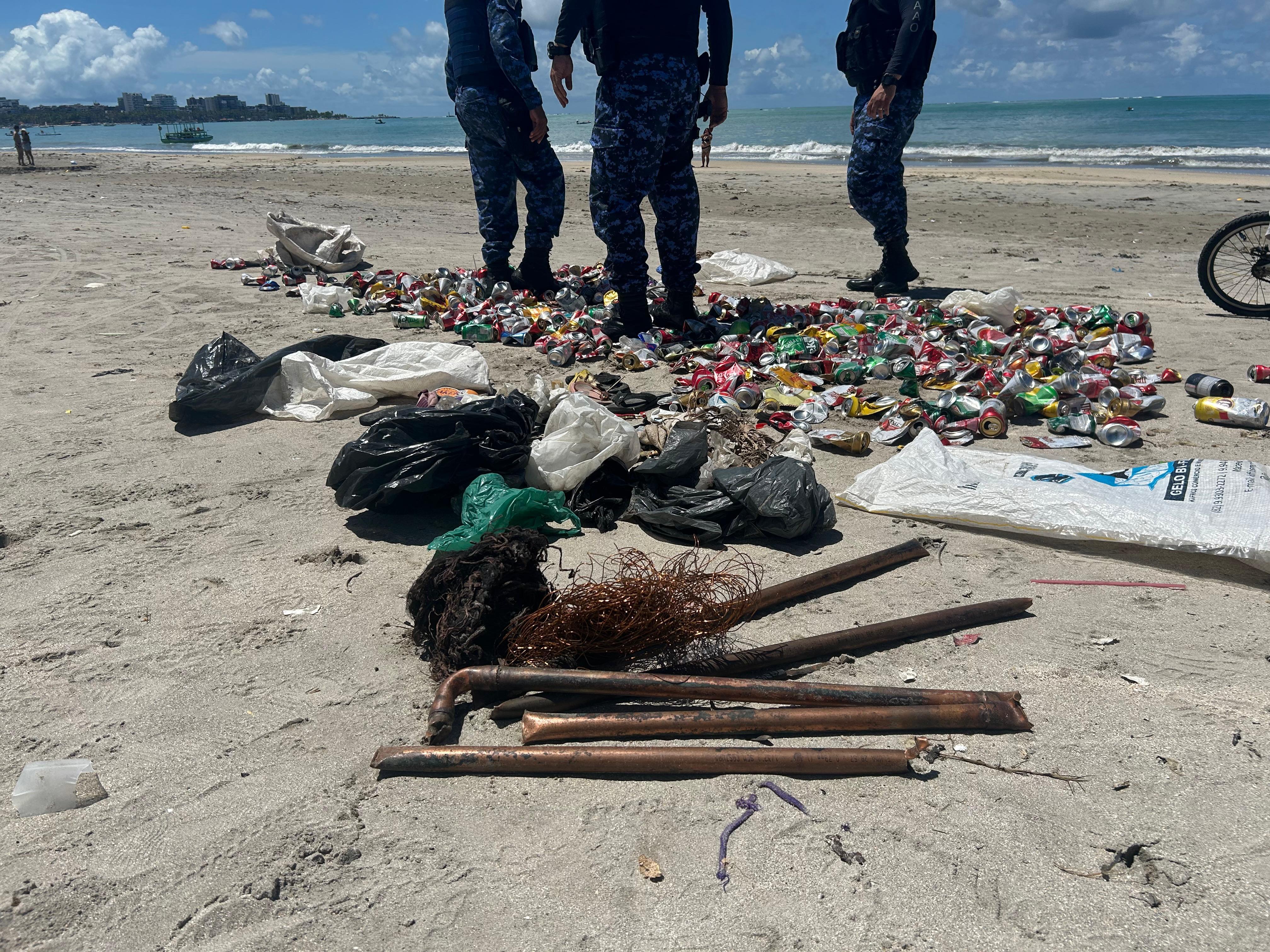 De acordo com os agentes, com o suspeito foram encontrados objetos possivelmente oriundos de furtos ou roubos, além de armas brancas. Entre os materiais apreendidos estão facas, cachimbo, peças de cobre e sacos com parafusos.