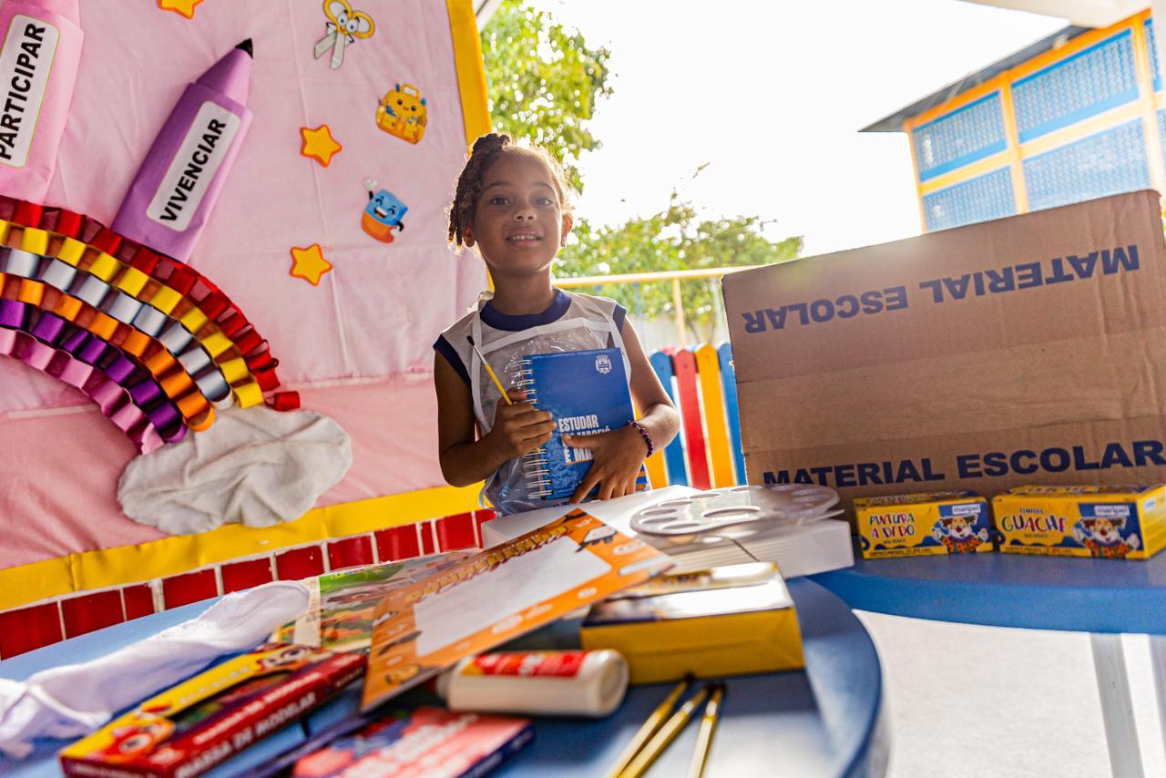 Entre os itens distribuídos ao maternal e pré-escola estão agenda pedagógica, toalha de mão, massa de modelar, giz de cera, cola branca, papel A4, pasta com elástico, livros para colorir, além de kit para pintura, com avental, tintas, pincéis e cola colorida.