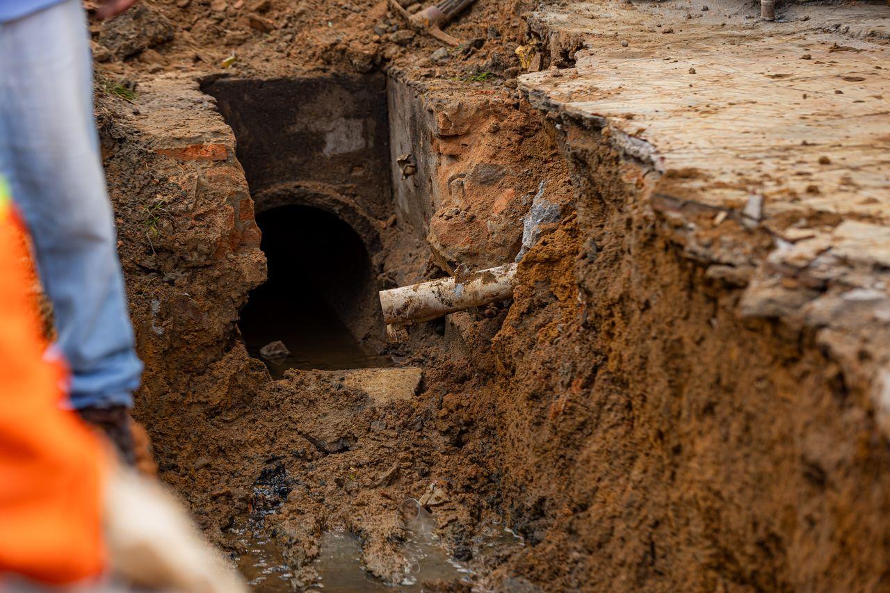 Após escavar a calçada do imóvel em que o morador apontava um afundamento, a equipe da Seminfra identificou ligação clandestina na rede de galeria de águas pluviais, o que fez o solo ceder e é considerado uma irregularidade grave.