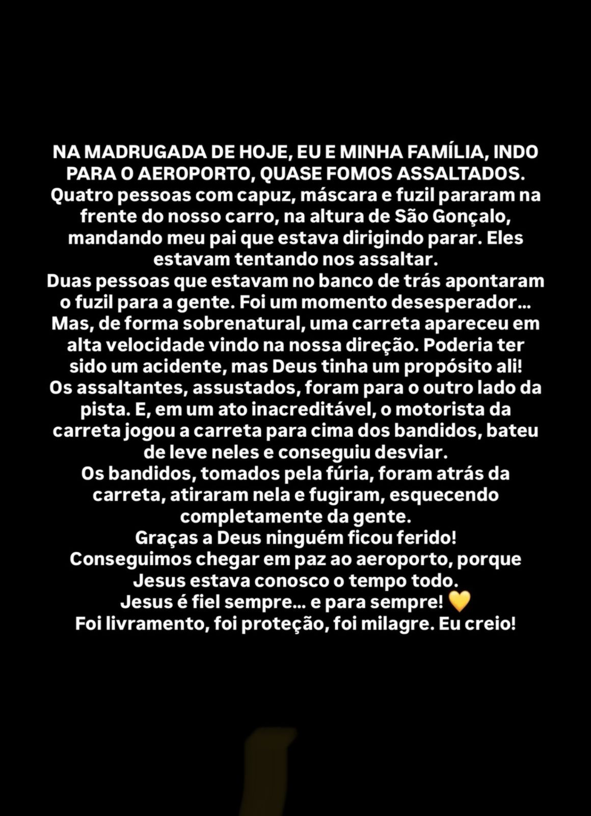 “Foi livramento, foi proteção, foi milagre. Deus estava conosco o tempo todo”, escreveu Maria Marçal ao agradecer por ninguém ter se ferido.