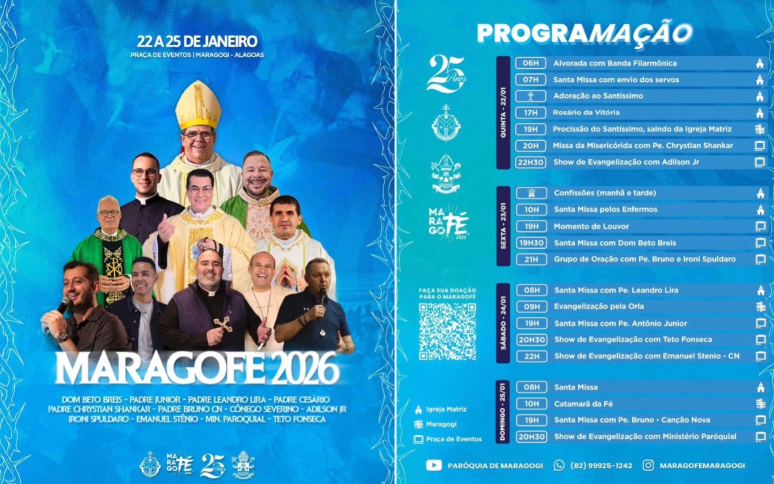 Entre os dias 22 e 25 de janeiro, o município de Maragogi sediará uma edição histórica do Maragofé, que celebra 25 anos de realização e se consolida como um dos mais importantes eventos de fé e evangelização da região. O encontro será realizado na praça de eventos, na orla marítima do município, reunindo fiéis, famílias e visitantes para quatro dias de intensa espiritualidade, louvor, celebração e profunda vivência cristã.